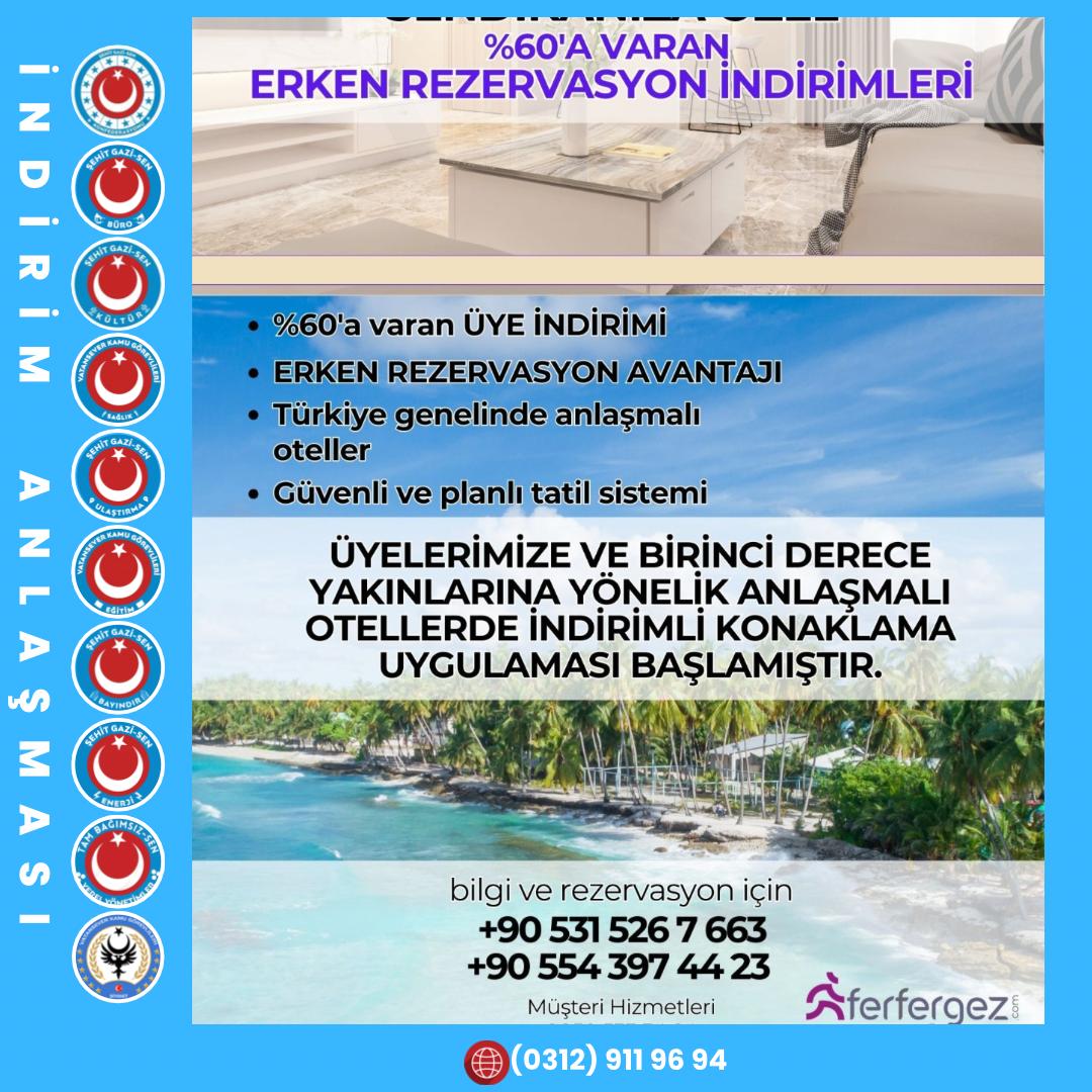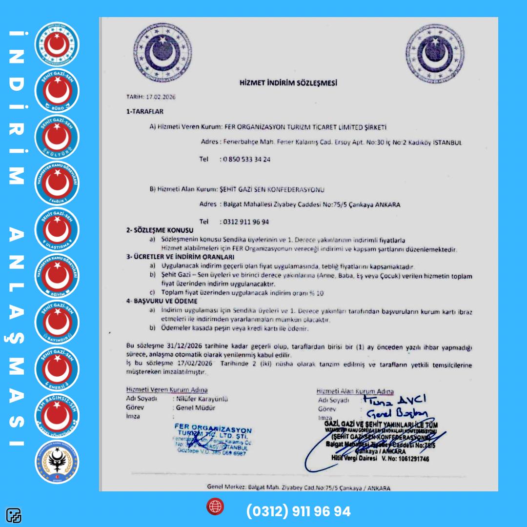 Şehit Gazi Sen Konfederasyonu olarak üyelerimizin sosyal ve ekonomik haklarını güçlendirmeye yönelik çalışmalarımız kapsamında, görselde yer alan Ferfergez Turizm ile indirim anlaşması sağlanmıştır.